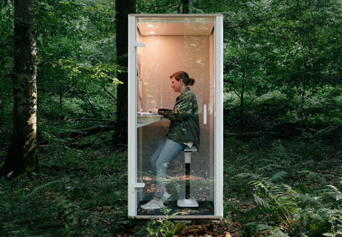 Akustikpaneele aus 100 % recyceltem PET sorgen dafür, dass Umgebungsgeräusche draußen und vertrauliche Gespräche in der Box bleiben.